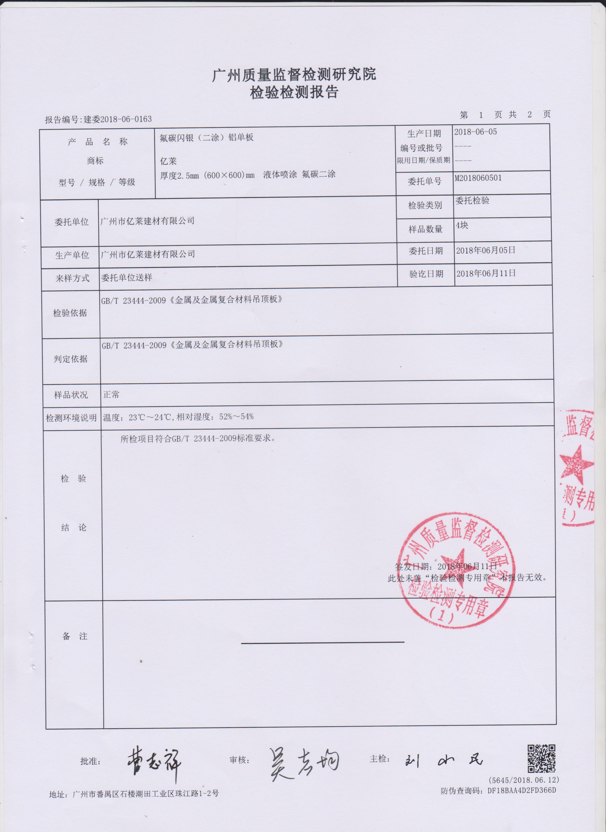 氟碳閃銀(二涂)鋁單板檢測報告