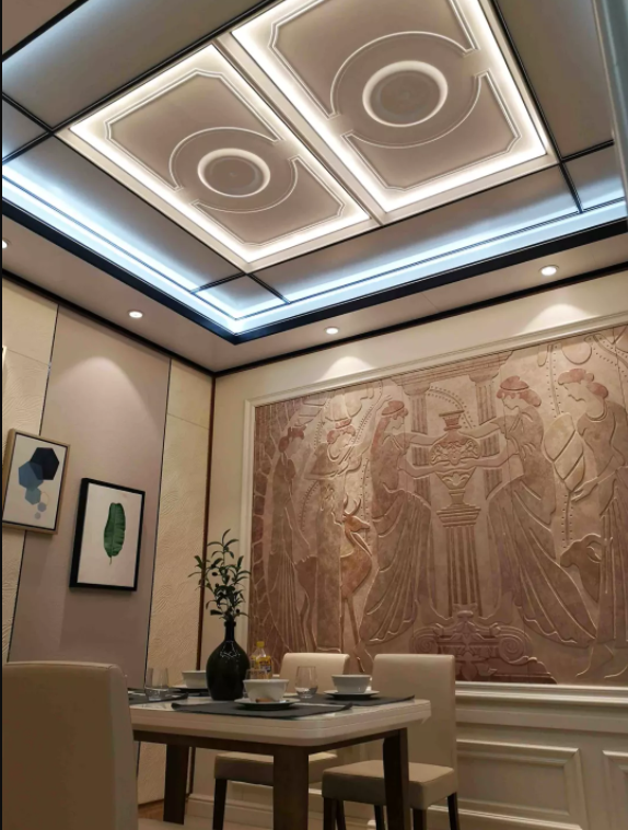 大規格安裝,從視覺上給人一種延伸擴大的感覺,使空間更顯開闊,成為不少別墅豪宅的首選。在產品設計上,大規格吊頂大板因為單片面積較大,可以承載的紋理設計元素更多,因此裝修出來的整體空間紋理圖案效果更加完整和立體,板面所體現的細節也更加豐富。