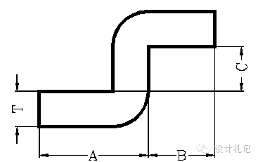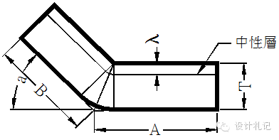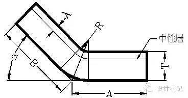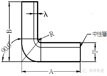 4.3 R≠0 θ=90° L=(A-T-R)+(B-T-R)+(R+λ)*π/2 當R ≧5T時 λ=T/2 1T≦ R <5T λ=T/3 0 < R <T λ=T/4 (實際展開時除使用尺寸計算方法外,也可在確定中性層位置后,通過偏移再實際測量長度的方法.以下相同) | ||
