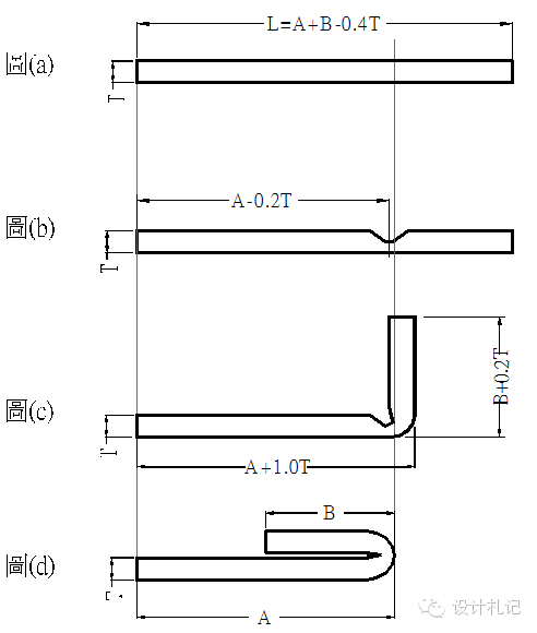4.13側沖壓平 圖(a): 展開長度 L=A+B-0.4T 圖(b): 壓線位置尺寸 A-0.2T 圖(c): 90°折彎處尺寸為A+1.0T 圖(d): 側沖壓平后的產品形狀 | ||
