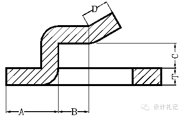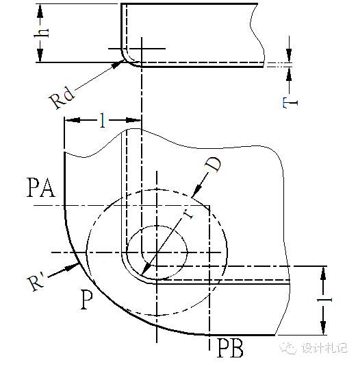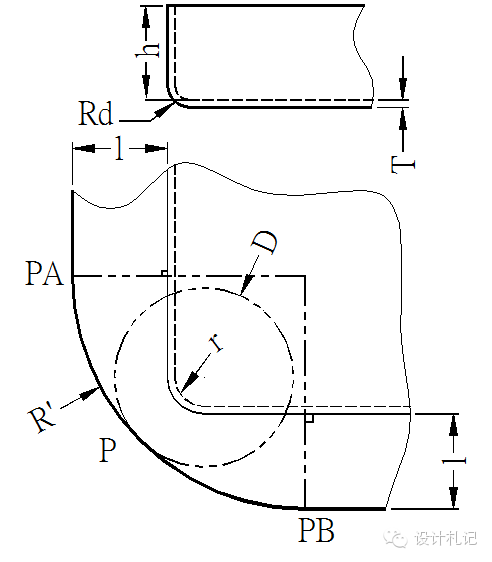 4.11壓縮抽形2 (Rd>1.5T) 原則:直邊部分按彎曲展開,圓角部分按拉伸展開,然后用三點切圓(PA-P-PB)的方式作一段與兩直邊和直徑為D的圓相切的圓弧. 當Rd>1.5T時: l按相應折彎公式計算. D/2={(r+T/3)2 +2(r+T/3)*(h+T/3) -0.86*(Rd-2T/3)*[(r+T/3) +0.16*(Rd-2T/3)]}1/2 | ||