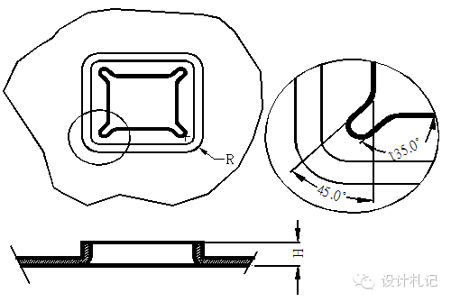 4.9 方形抽孔 方形抽孔,當抽孔高度較高時(H>Hmax),直邊部展開與彎曲一致, 圓角處展開按保留抽高為H=Hmax的大小套彎曲公式展開,連接處用45度線及圓角均勻過渡, 當抽孔高度不高時(H≦Hmax)直邊部展開與彎曲一致,圓角處展開保留與直邊一樣的偏移值. 以下Hmax取值原則供參考. 當R≧4MM時: 材料厚度T=1.2~1.4取Hmax =4T 材料厚度T=0.8~1.0取Hmax =5T 材料厚度T=0.7~0.8取Hmax =6T 材料厚度T≦0.6取Hmax =8T 當R<4MM時,請示上級. | ||