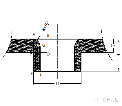 4.8 抽芽 抽芽孔尺寸計算原理為體積不變原理,即抽孔前后材料體積不變;ABCD四邊形面積=GFEA所圍成的面積. 一般抽孔高度不深取H=3P(P為螺紋距離),R=EF見圖 ∵ T*AB=(H -EF)*EF+π*(EF)2/4 ∴ AB={H*EF+(π/4-1)*EF2}/T ∴預沖孔孔徑=D – 2AB T≧0.8時,取EF=60%T. 在料厚T<0.8時,EF的取值請示上級. | ||